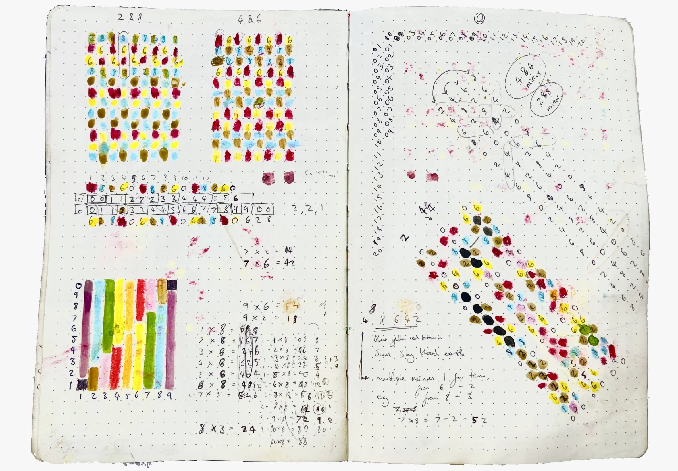 An in-depth page by page explanation of how I created the Multicolour Maths method, from severe maths anxiety and finger counting to a fluid pictorial language.
